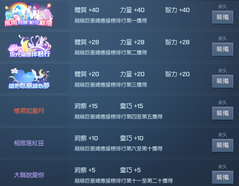 楚小航8月份共儲值了30,000元。共可獲得【圖片稱號:風雨同歸,相伴相隨(體質+40、力量+40、智力+40)+ 圖片稱號:流光落雪伴君行(體質+28、力量+28、智力+28)+圖片稱號:總把心意織心夢(體質+20、力量+20、智力+20)+ 文字稱號:惜君如星月(洞察+15、靈巧+15))+ 文字稱號:相思落紅豆(洞察+10、靈巧+10)+ 文字稱號:大聲說愛你(洞察+5、靈巧+5) + 時光印記 II *1】