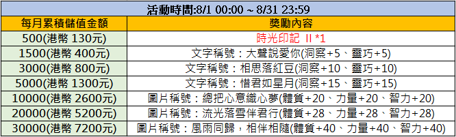 龍族幻想推出8月份累儲活動!!只要當月累計儲值500元就贈送時光印記 II *1!
